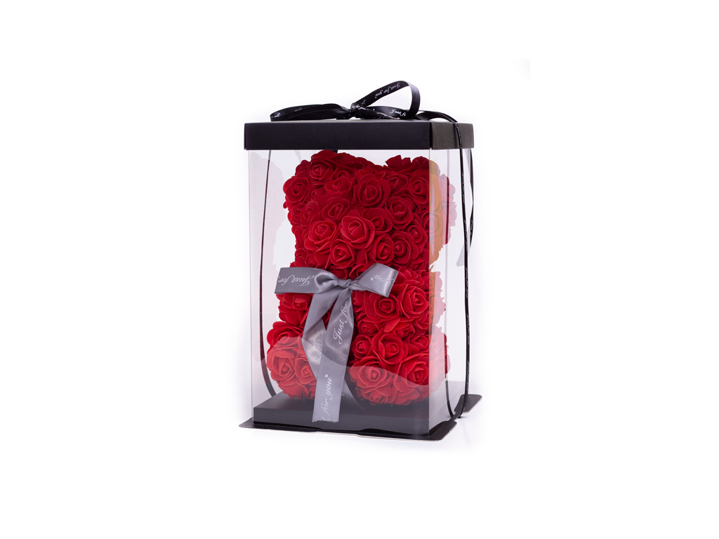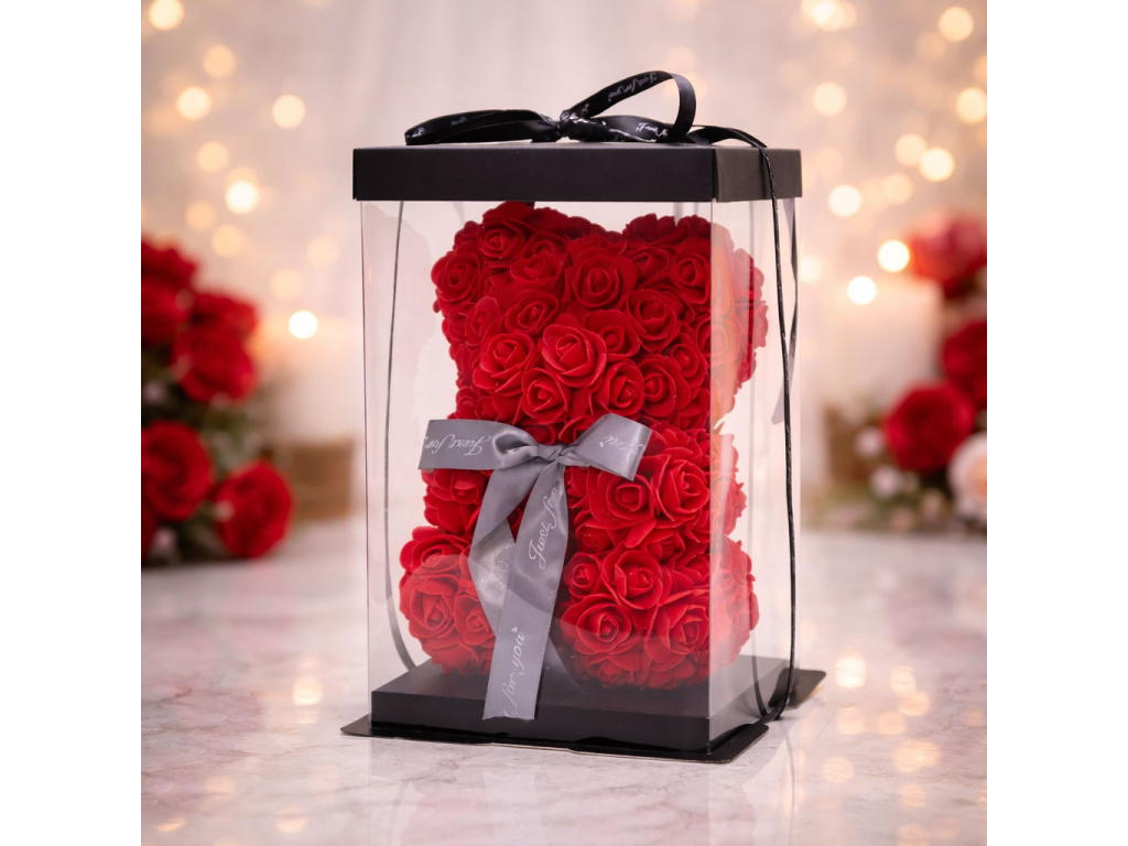Darček, ktorý hovorí jazykom lásky. Červený medveď z ruží je silným symbolom vášne, romantiky a hlbokých citov. Precízne ručne tvarovaný z kvalitných penových ruží, ktoré si dlhodobo zachovávajú svoj tvar aj farbu. Umiestnený v elegantnej priehľadnej darčekovej krabičke s mašľou, takže je pripravený na okamžité darovanie.
