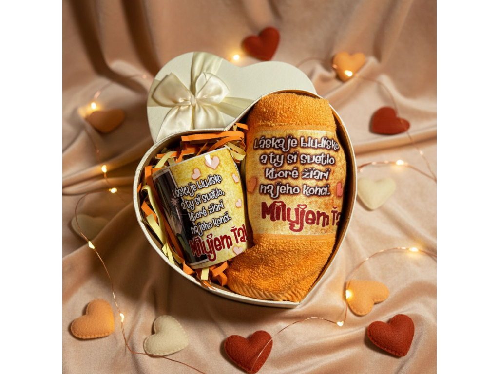 Valentínsky FlowerBox v tvare srdca – Uterák s potlačou & Hrnček
